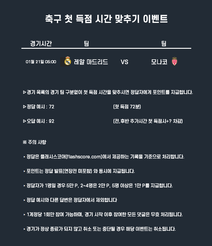 1월21일 포인트 이벤트 축구(첫 득점시간 맞추기)