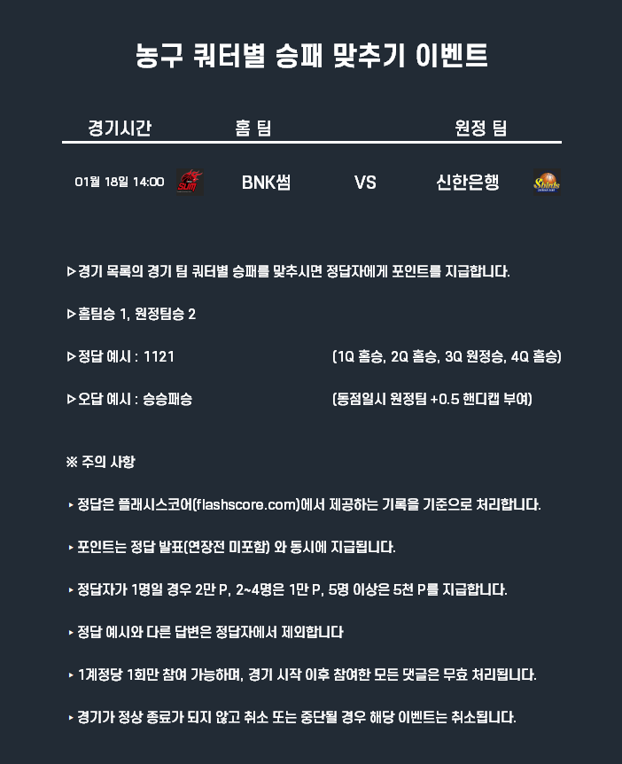 1월18일 포인트 이벤트 농구(쿼터별 승패 맞추기)