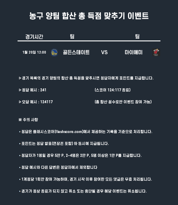 1월 20일 포인트 이벤트 농구(양팀 합산 총득점 맞추기)