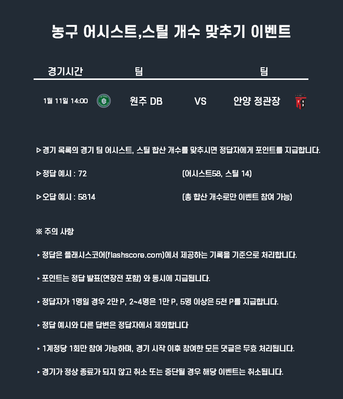 1월11일 포인트 이벤트 농구(어시스트 스틸 개수 맞추기)
