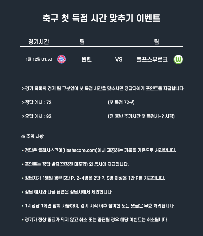 1월12일 포인트 이벤트 축구(첫 득점시간 맞추기)