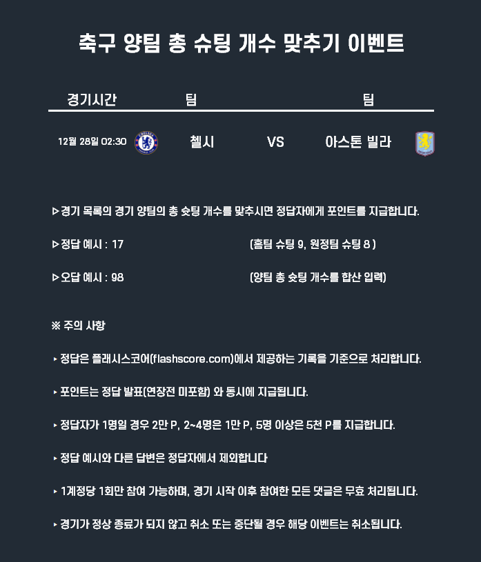 12월28일 포인트 이벤트 축구(양팀 총 슈팅 개수 맞추기)