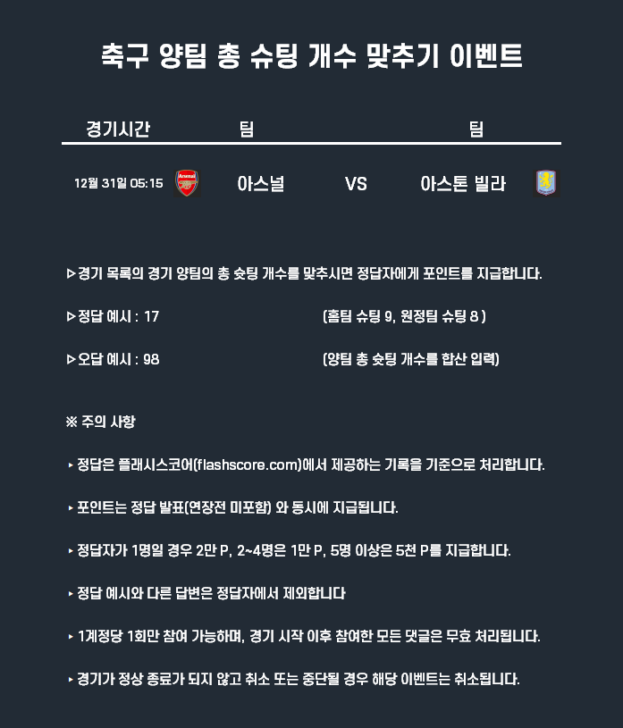 12월31일 포인트 이벤트 축구(양팀 총 슈팅 개수 맞추기)