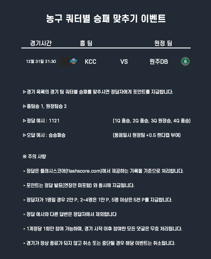 12월31일 포인트 이벤트 농구(쿼터별 승패 맞추기)