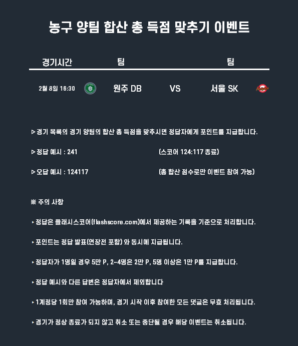 2월8일 포인트 이벤트 농구(양팀 합산 총득점 맞추기)