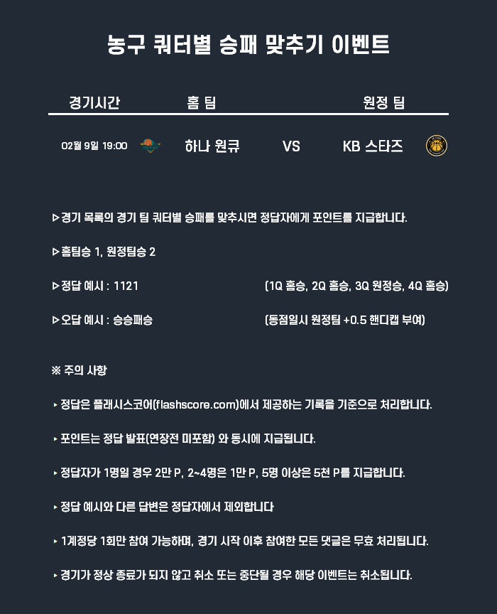 2월5일 포인트 이벤트 농구(쿼터별 승패 맞추기)