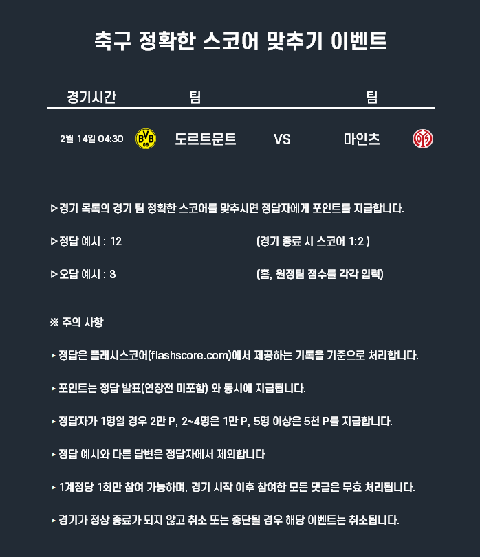 2월14일 포인트 이벤트 축구(정확한 스코어 맞추기)