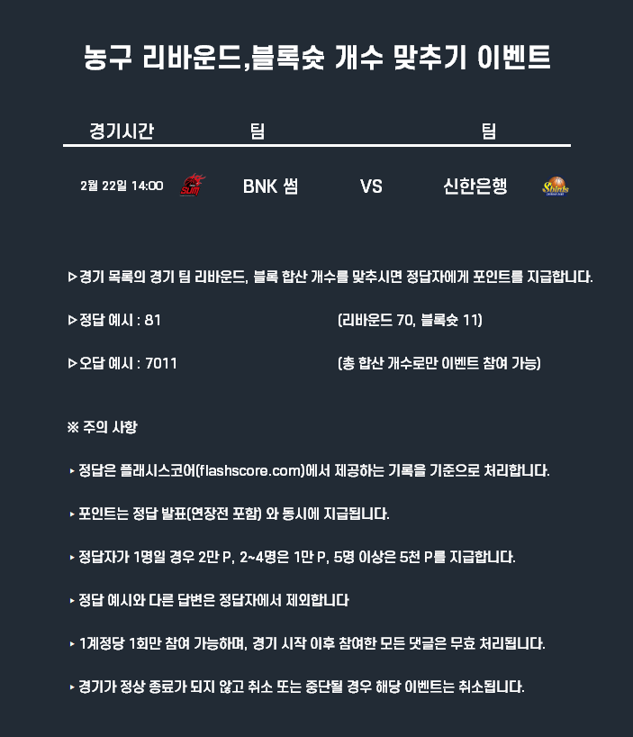 2월22일 포인트 이벤트 농구(리바운드 블록슛 개수 맞추기)
