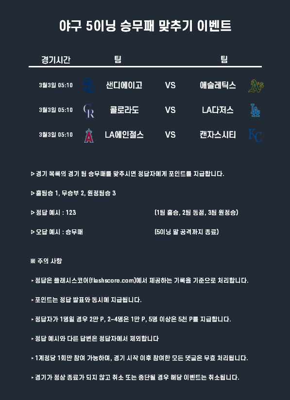 3월3일 포인트 이벤트 야구(5이닝 승무패 맞추기)