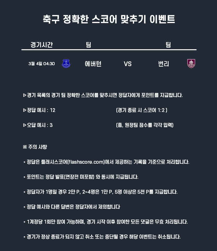 3월4일 포인트 이벤트 축구(정확한 스코어 맞추기)