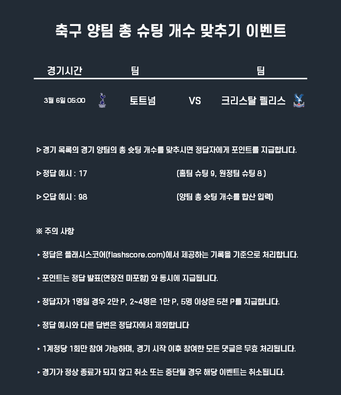 3월6일 포인트 이벤트 축구(양팀 총 슈팅 개수맞추기)