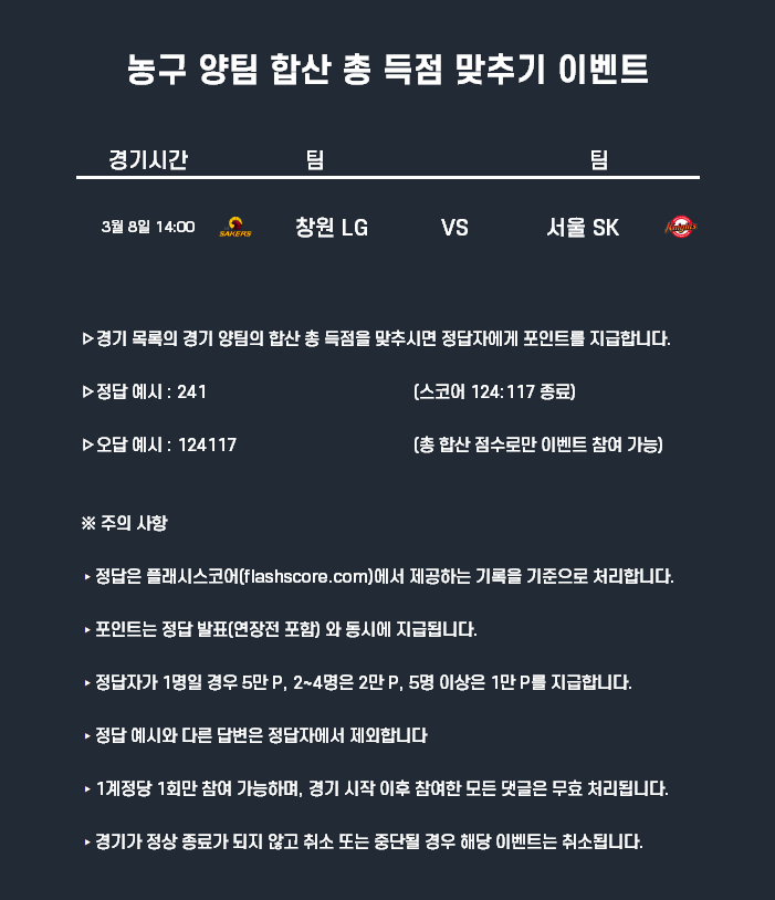 3월8일 포인트 이벤트 농구(양팀 합산 총득점 맞추기)