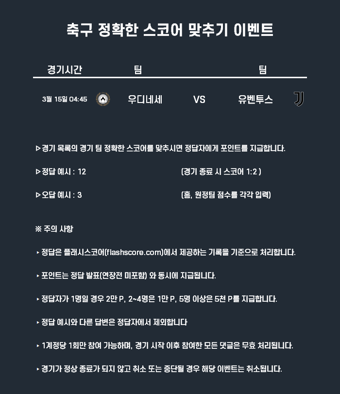 3월15일 포인트 이벤트 축구(정확한 스코어 맞추기)