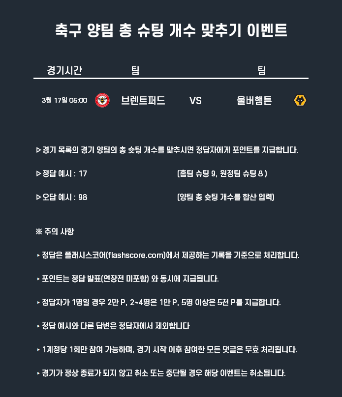 3월17일 포인트 이벤트 축구(양팀 총 슈팅 개수맞추기)