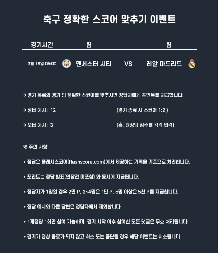 3월18일 포인트 이벤트 축구(정확한 스코어 맞추기)
