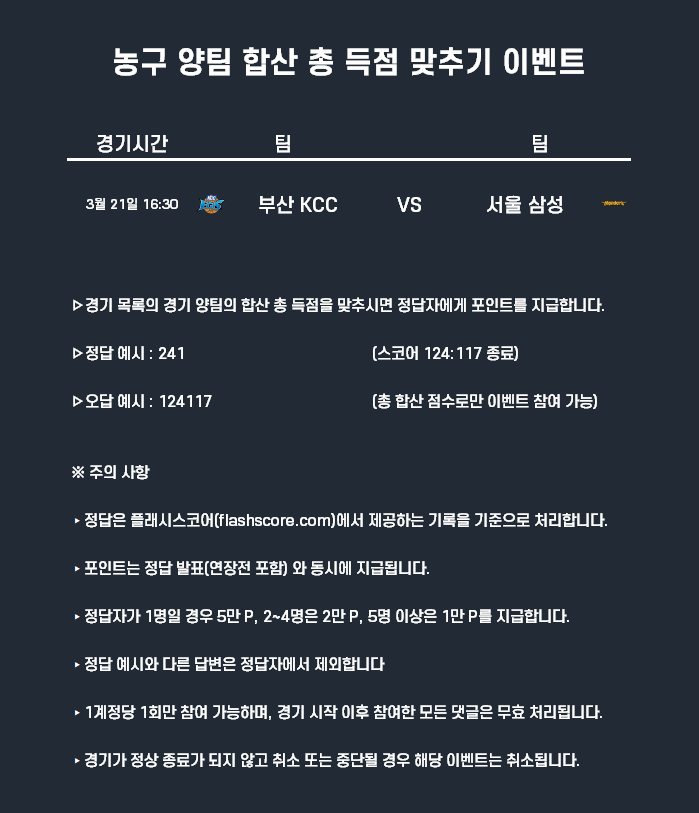 3월21일 포인트 이벤트 농구(양팀 합산 총득점 맞추기)