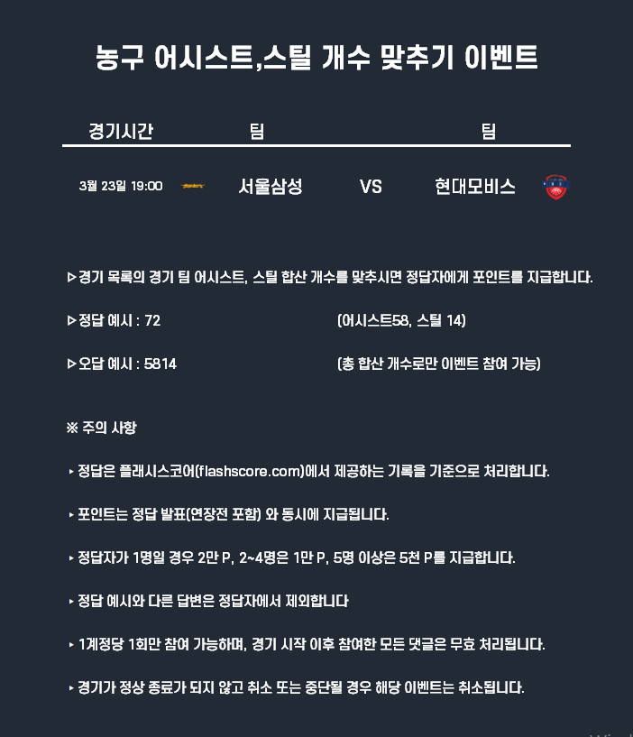 3월23일 포인트 이벤트 농구(어시스트 스틸 개수 맞추기)