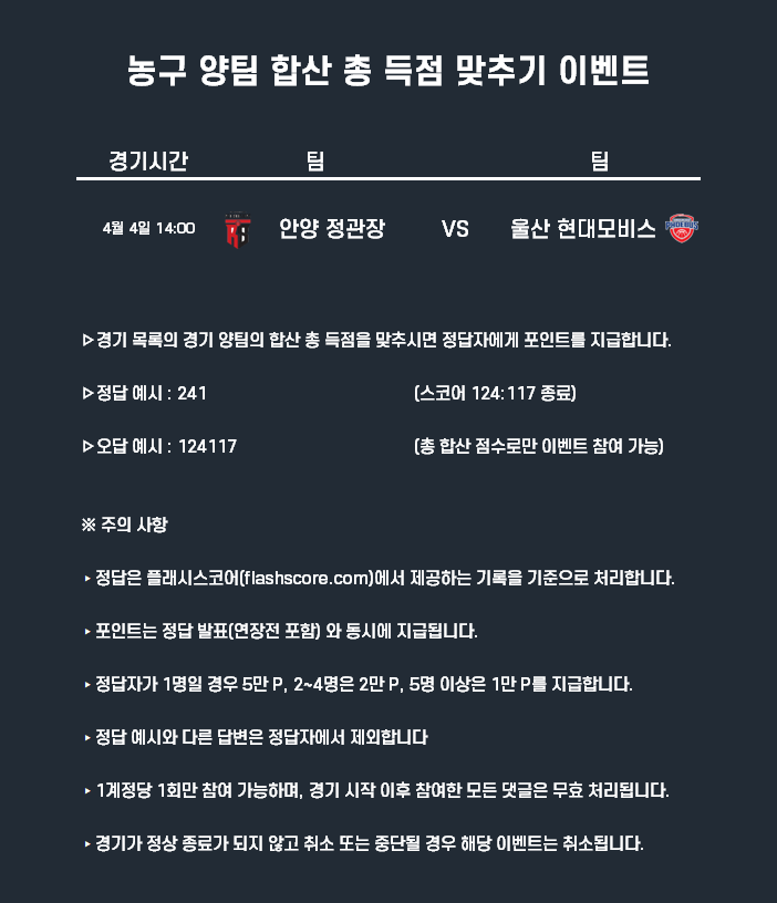 4월4일 포인트 이벤트 농구(양팀 합산 총 득점 맞추기)