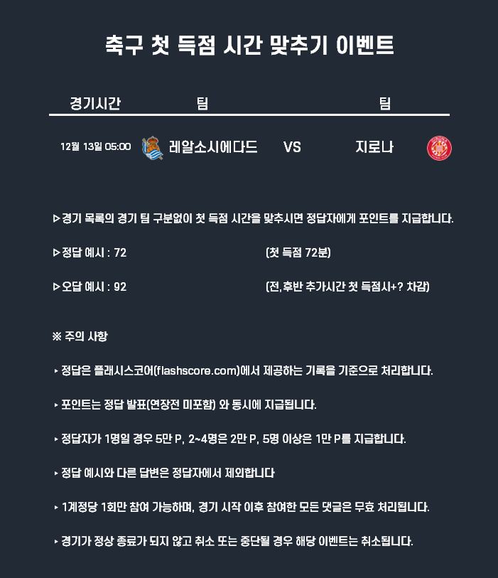 12월13일 포인트 이벤트 축구(첫 득점 시간 맞추기)