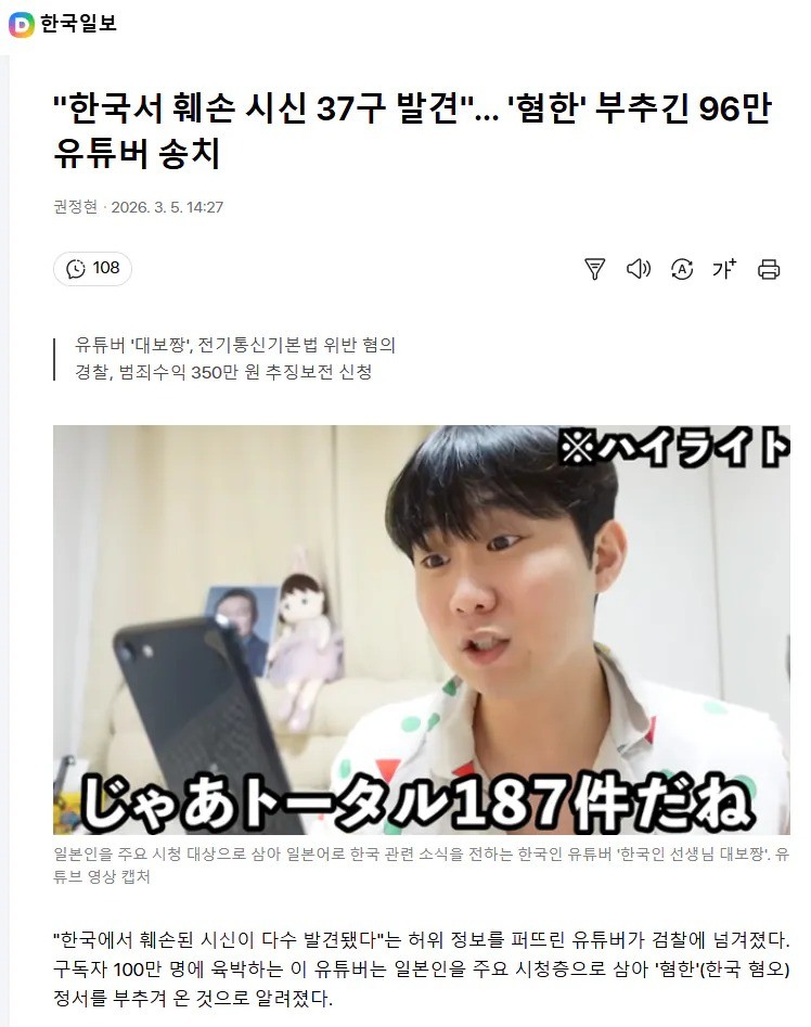 혐한 쪽바리들 상대로 혐한 장사하다 검찰 송치된 원종이