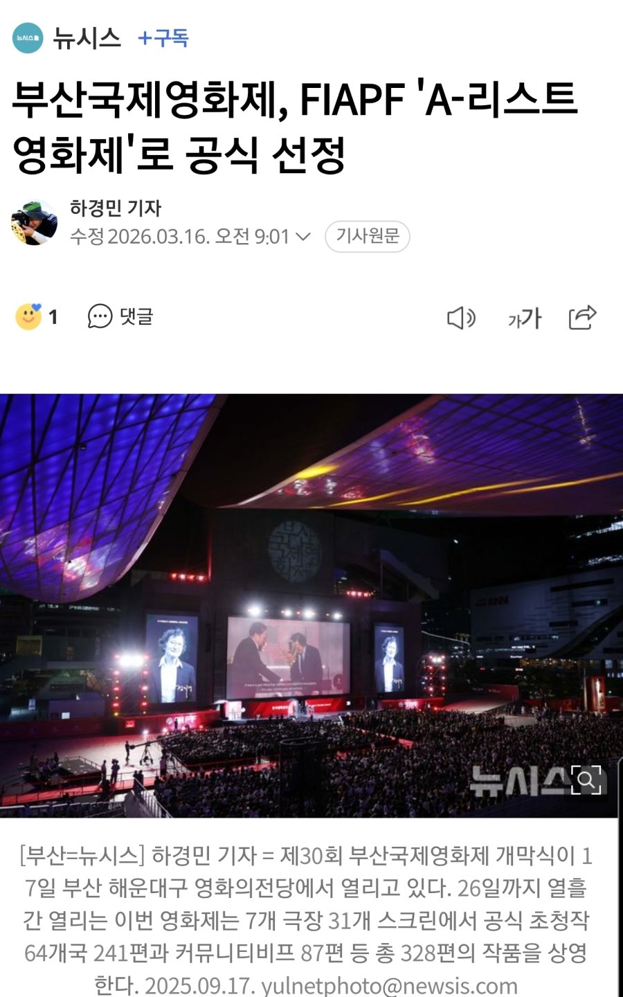 부산국제영화제, FIAPF 'A-리스트 영화제'로 공식 선정 :: 공감언론 뉴시스 ::