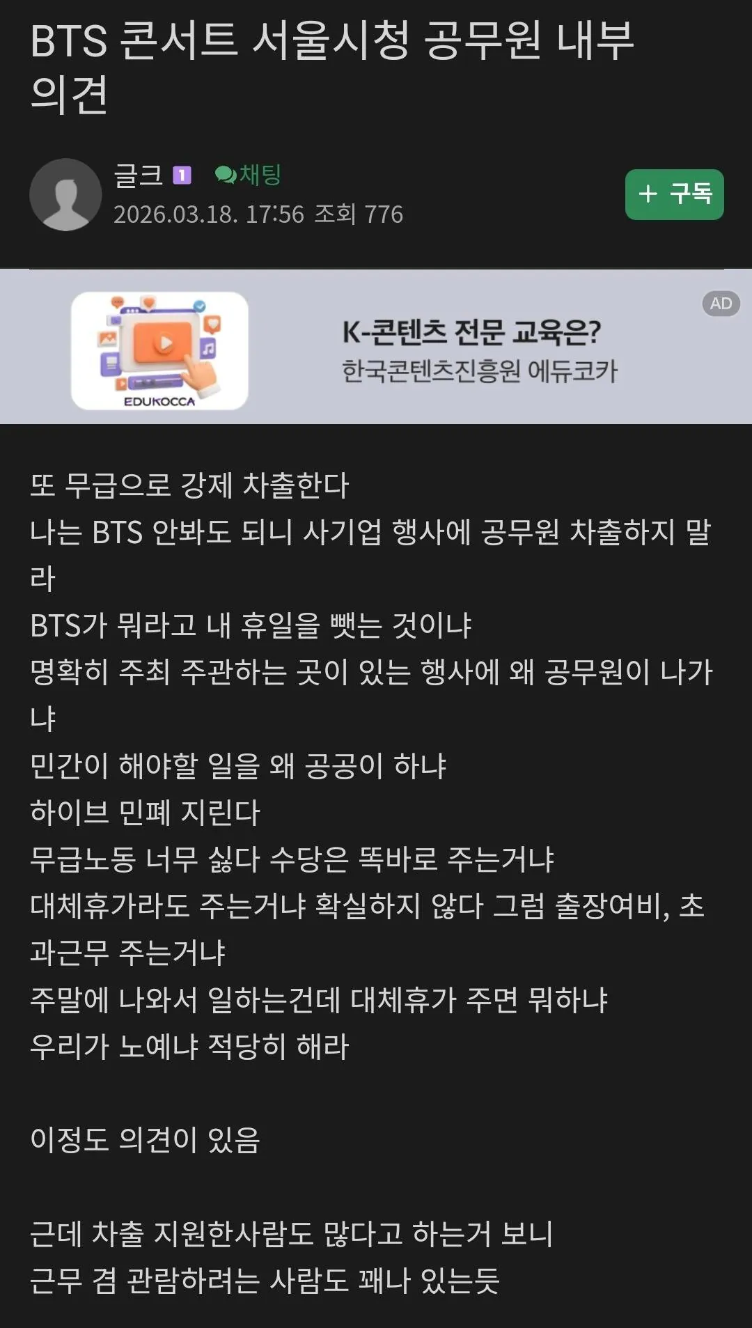 BTS공연 무급 차출되는 서울시 공무원 내부 반응
