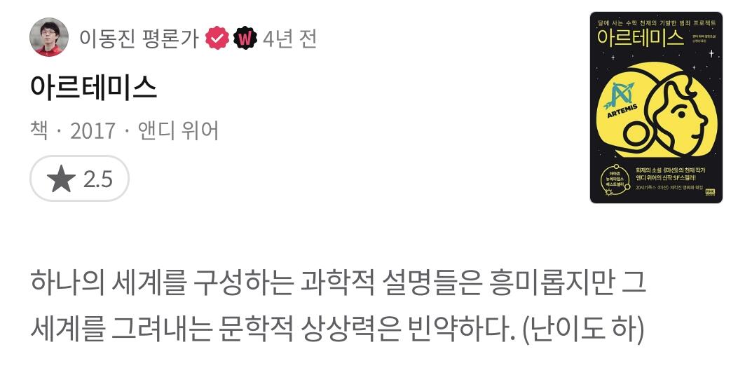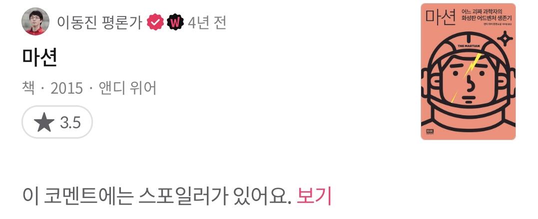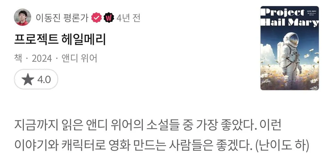 이동진 평론가 <프로젝트 헤일메리> 두줄평