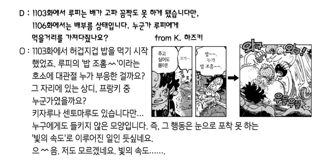 오다 작가님은 이에 대해서 그 행동은 눈으로 포착 못 하는 빛의 속도로 이루어진 일이다..