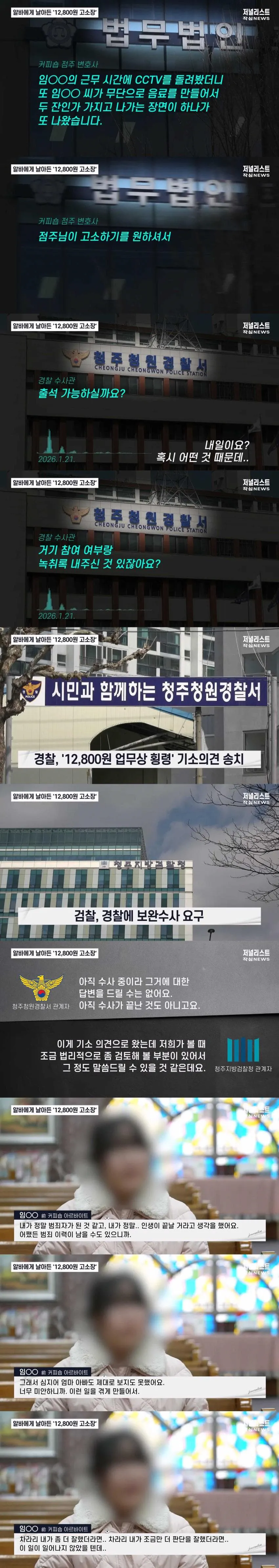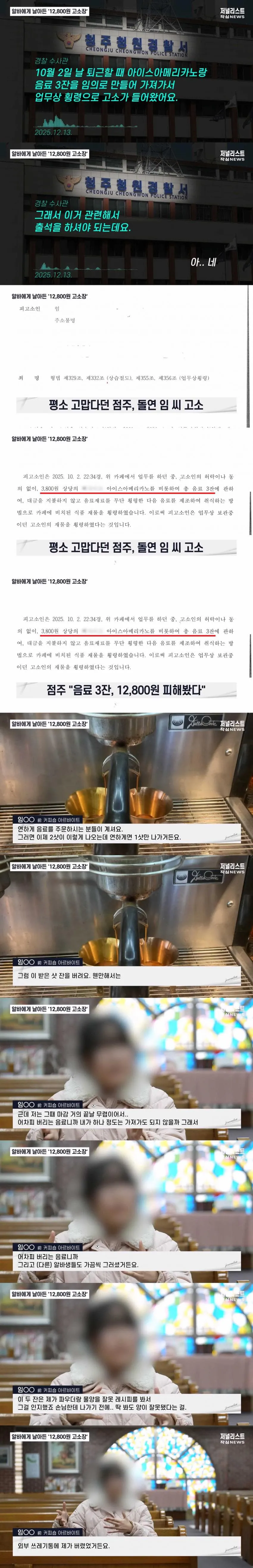 1. 성실히 근무했던 알바생이 퇴사 후 점주로부터 12,800원 상당의 음료 횡령 및 절도 혐의로 고소당함.