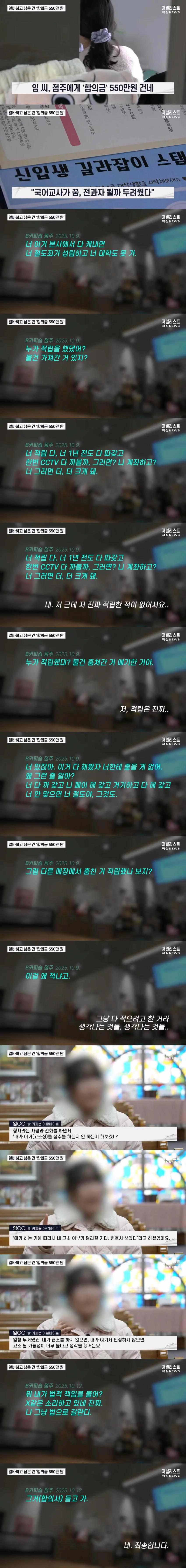 3. 이전 근무지 점주 또한 고소를 빌미로 협박하여, 알바생은 5개월 치 급여보다 많은 550만 원을 합의금으로 뺏김.