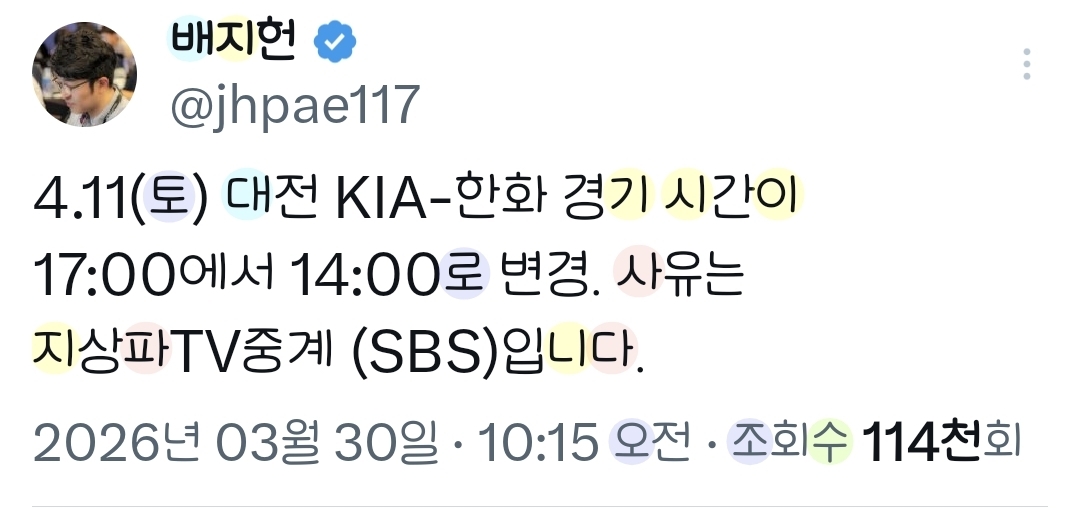 한화만 개막후 이주연속 공중파로 경기 시간 변경됨