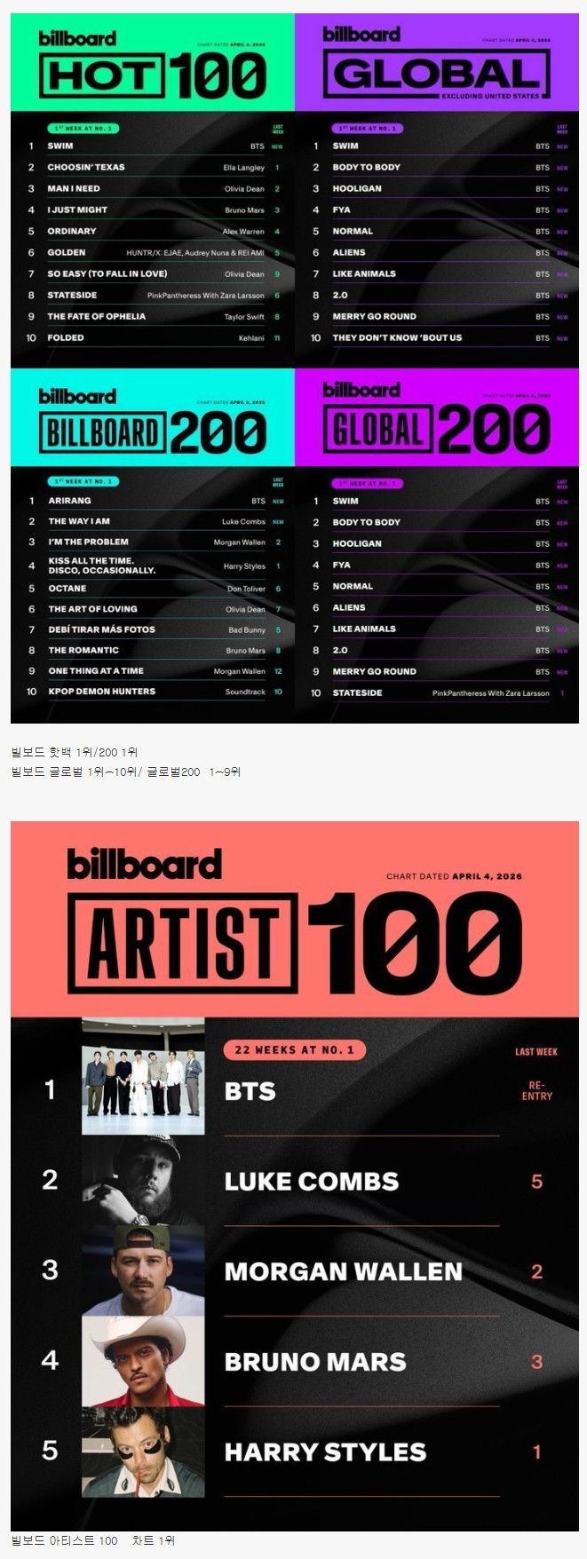 BTS 빌보드 4월 첫째주 모든 차트 석권