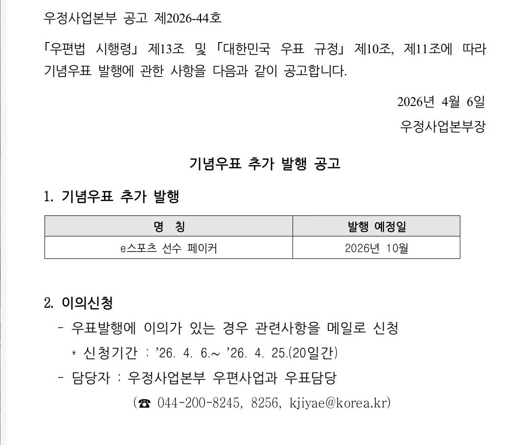 「우편법 시행령」 제13조 및 「대한민국 우표 규정」 제10조, 제11조에 따라 기념우표 발행에 관한 사항을 다음과 같이 공고합니다.