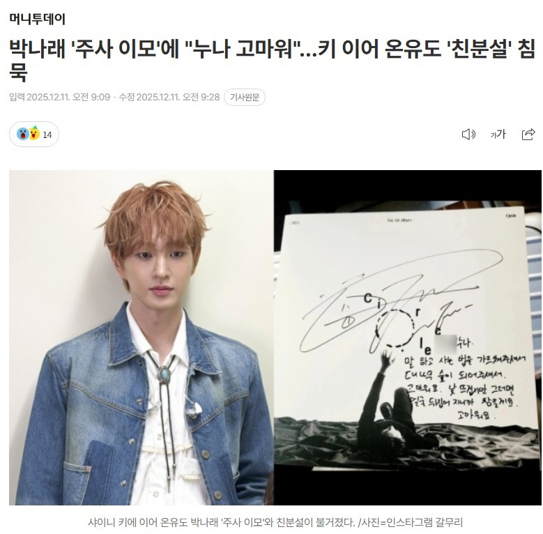 샤이니 키를 향해 박나래 '주사 이모'와 친분설을 해명하라는 요구가 빗발치고 있는 가운데 주사 이모가 온유와도 친분이 있는 것으로 드러났다.