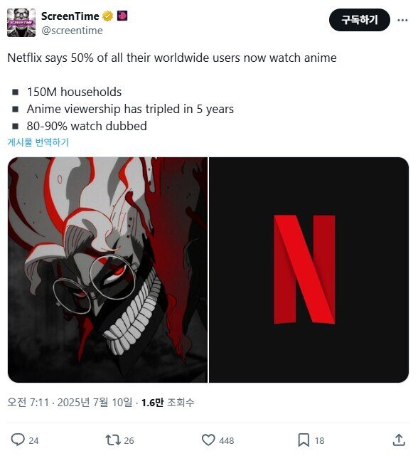 넷플 전체 구독자의 50%가 애니메를 시청함.