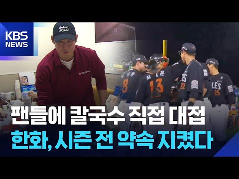 ​프로야구 한화이글스 선수들이 팬들을 초청해 따끈한 칼국수를 대접했습니다. 지난해 시즌을 시작하면서 내걸었던  공약을 지킨 건데요.
