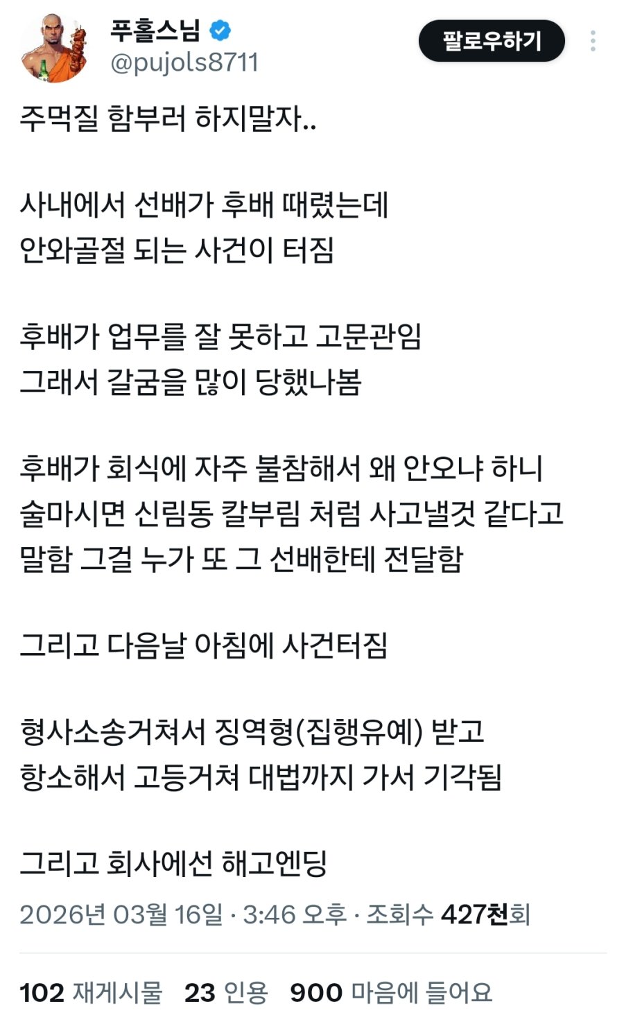 후배를 주먹으로 팬 선배