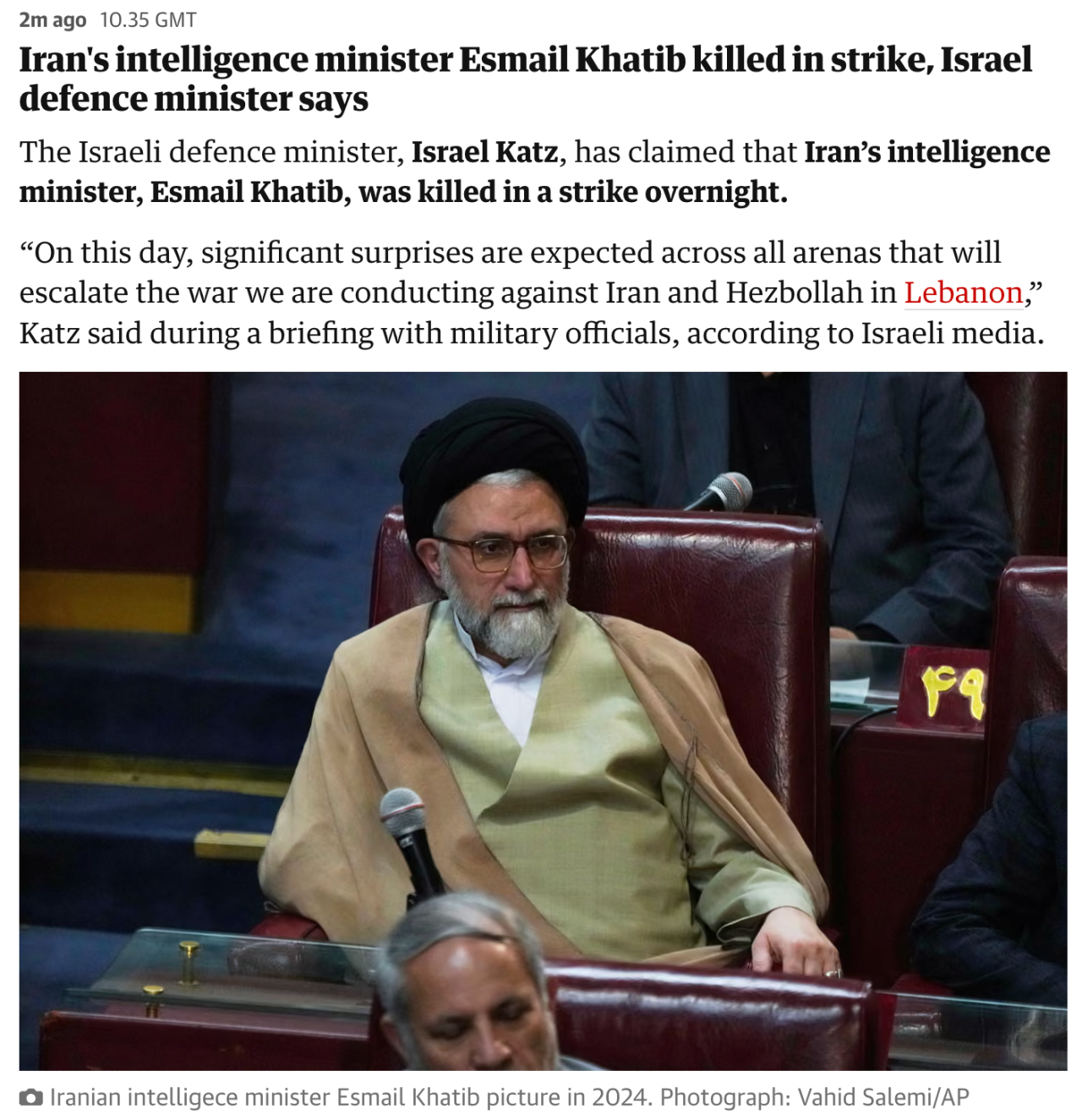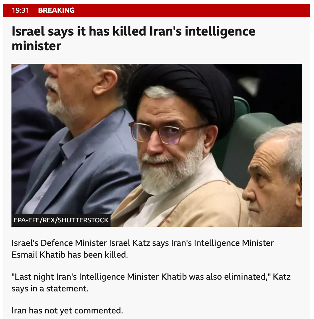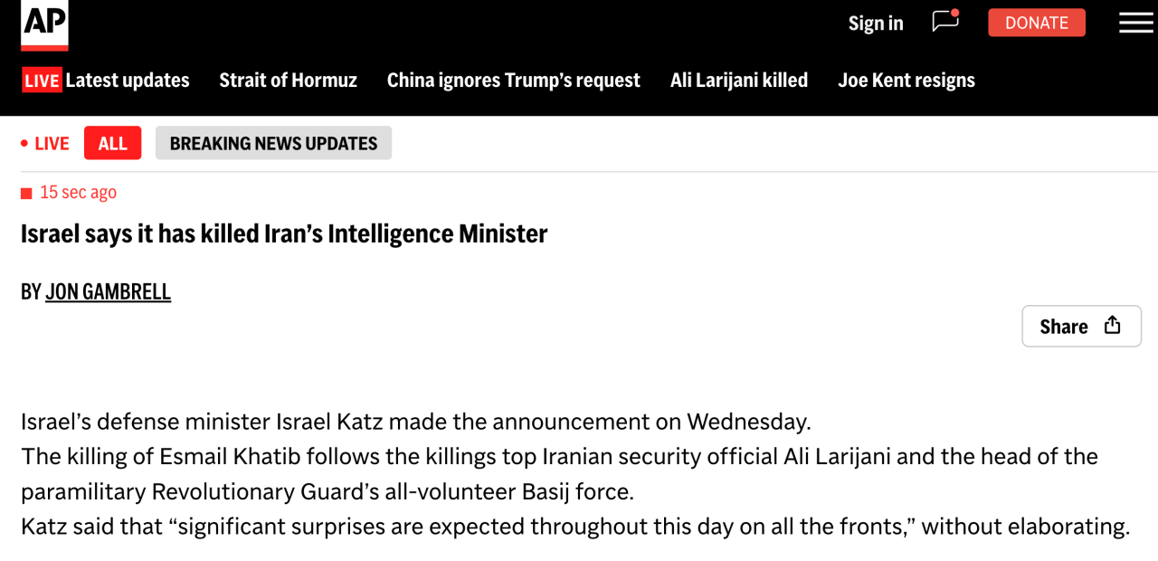 이스라엘 카츠(Israel Katz) 국방부 장관은 수요일, 이란의 정보부 장관 에스마일 카팁(Esmail Khatib)을 사살했다고 발표했습니다. 이번 작전은 이란의 고위 안보 책임자 알리 라리자니와 혁명수비대 산하 바시지 민병대 지휘관이 잇따라 사살된 뒤 이루어진 후속 조치입니다.