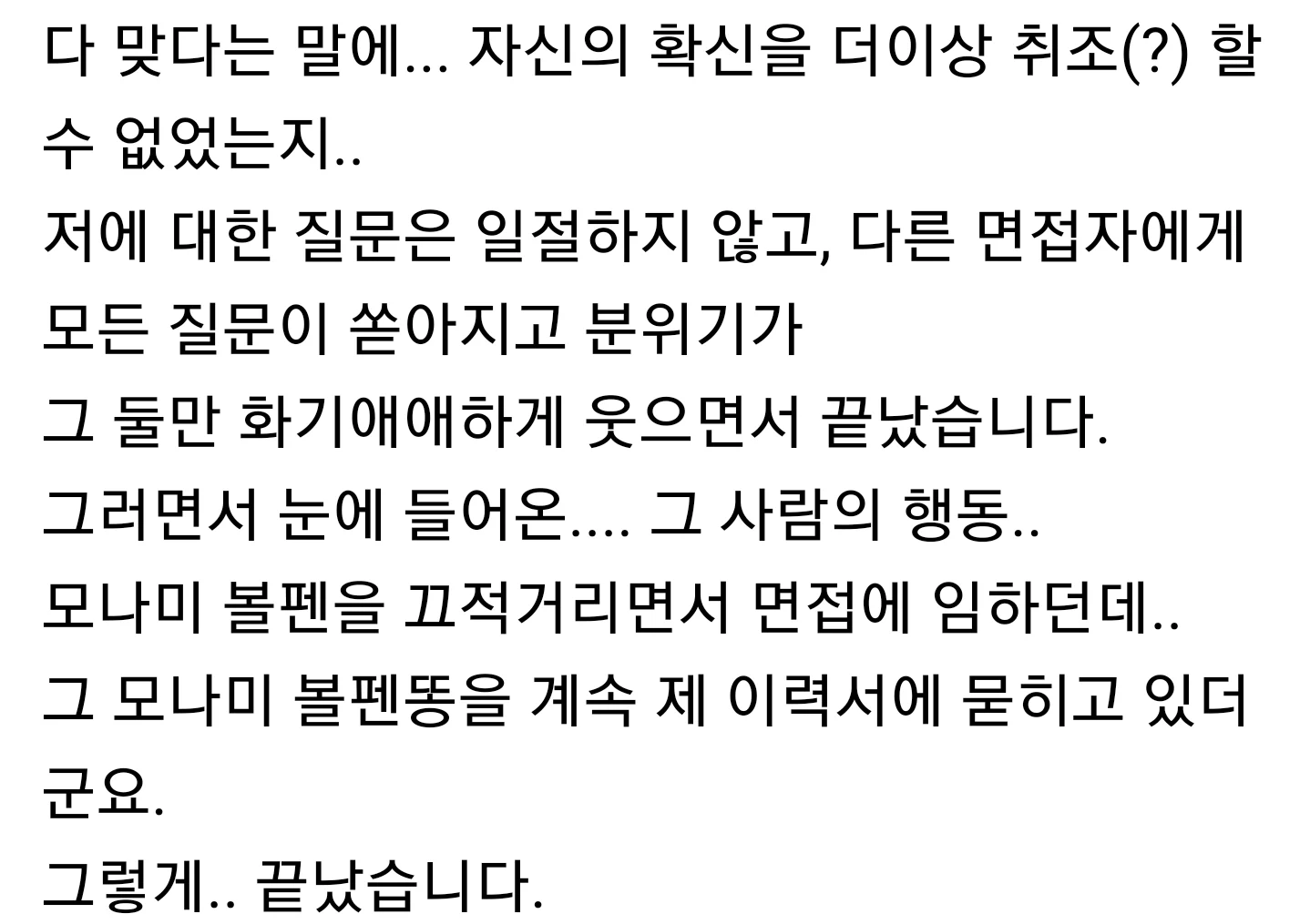 4. 이후 면접에서 나는 질문을 받지 못했고 나의 이력서에 면접관은 볼펜똥을 묻히며 면접이 끝남
