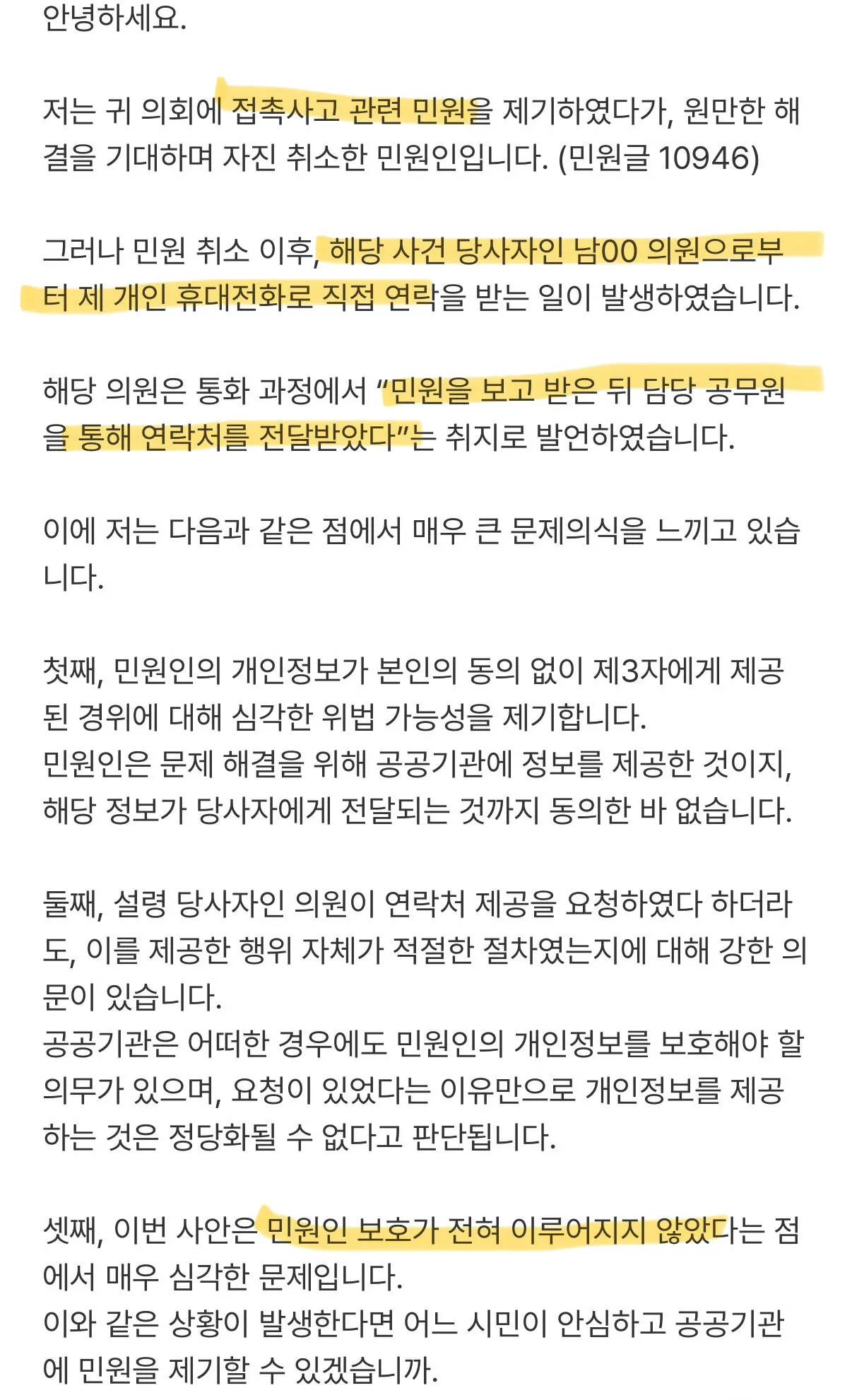 민원인이 의회사무처에 항의성 민원을 넣었으나 넣자 그 도의원은 민원인의 전화번호 등 신상정보를 담당 공무원에게 보고받음