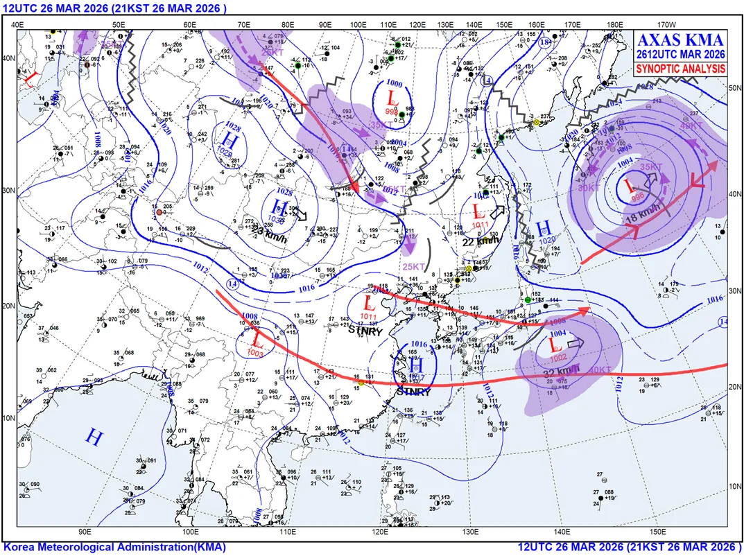저기압이 우리나라 경기만쪽으로 이동해 들어와 있고, 고기압은 제주 서쪽에 있는 것으로 추정되는 기류 상태. 기상청 일기도 업로드 시점과 어스널 스쿨 업데이트 시점 감안하면 거의 맞아 떨어지는 수준
