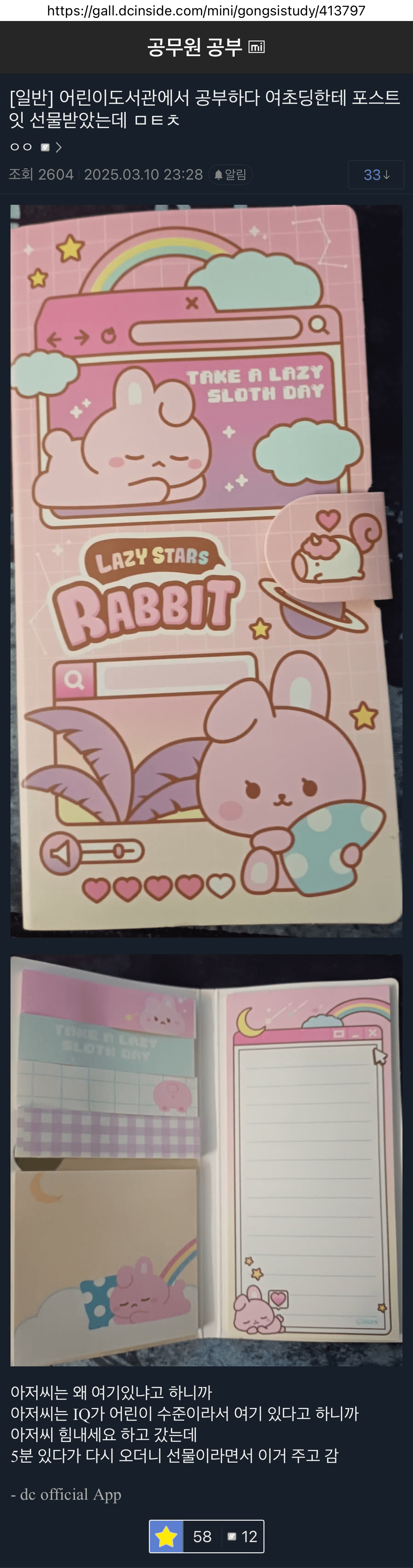 어린이 도서관에서 여초딩한테 포스트잇 받은 디시인