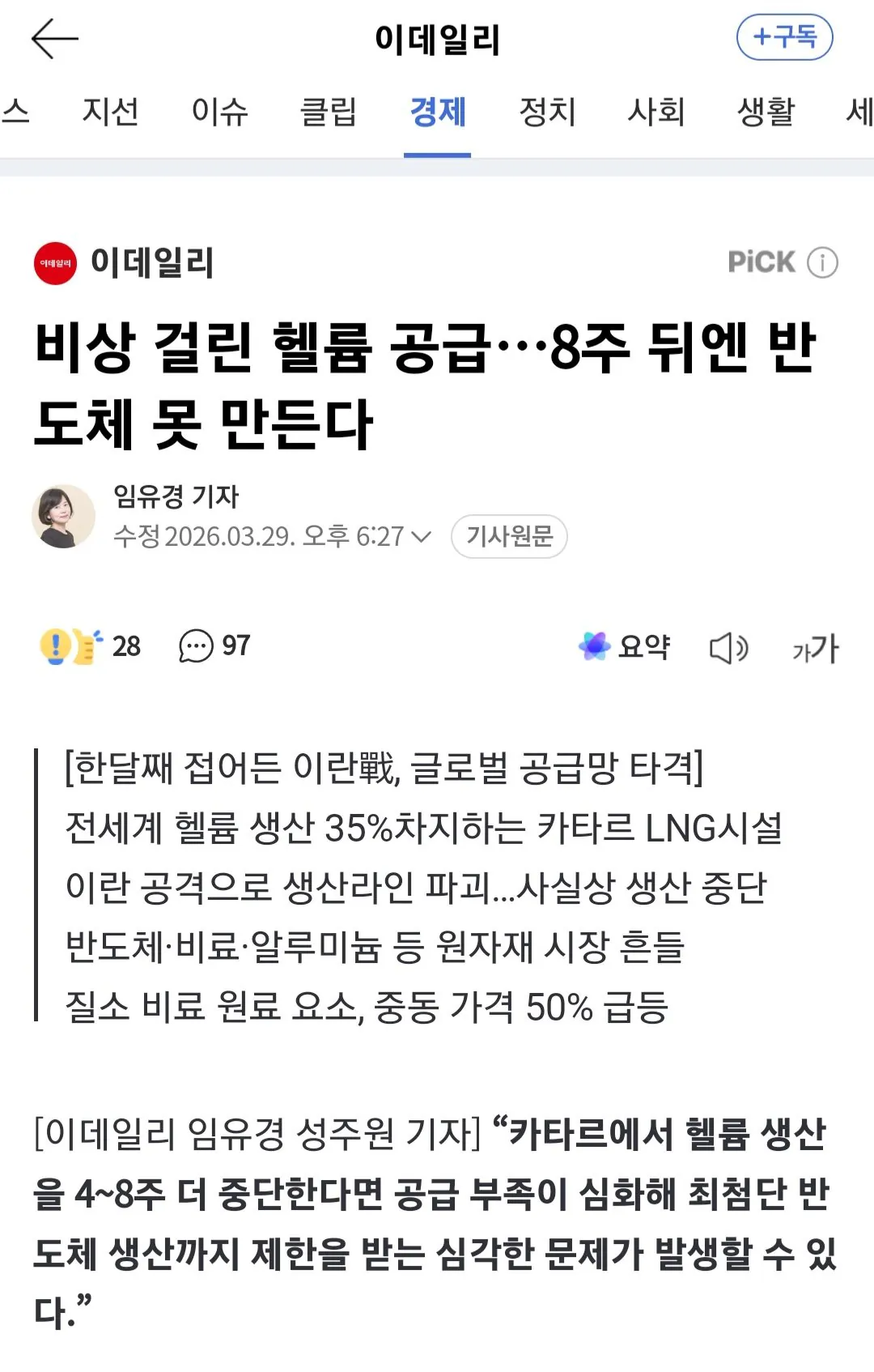 반도체 핵심 공정에 쓰이는 헬륨은 사실상 공급 중단 상태다. 카타르는 전 세계 헬륨 생산 능력의 약 35%를 차지하는데 세계 최대 라스라판 LNG 시설이 이란의 공격으로 헬륨 생산라인이 파괴됐다. 전문가들은 카타르의 라스라판 산업단지 복구에는 최장 5년이 걸릴 것으로 내다보고 있다