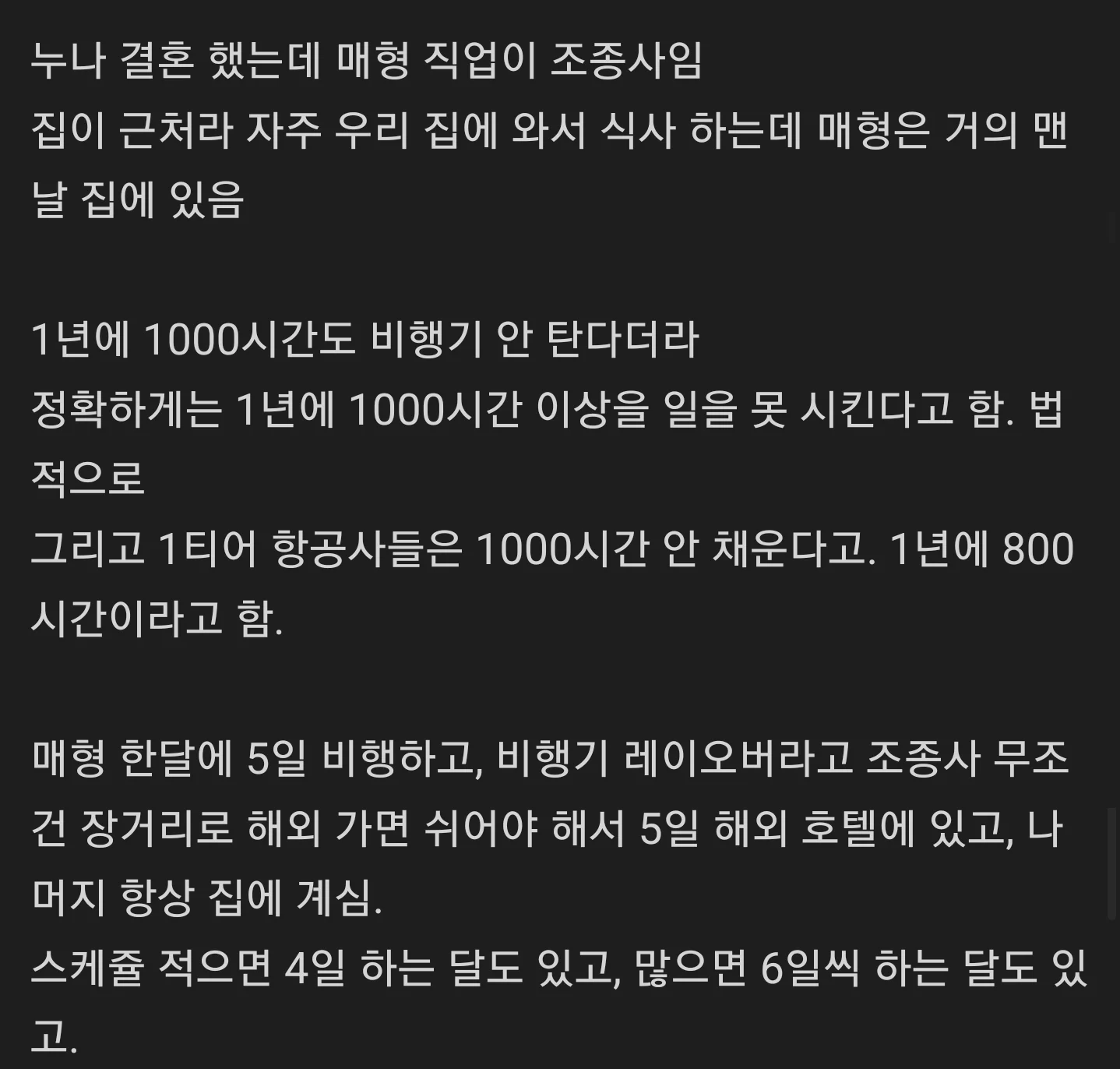 작성자 매형은 비행기 조종사다 집에서 쉬는 날이 많음