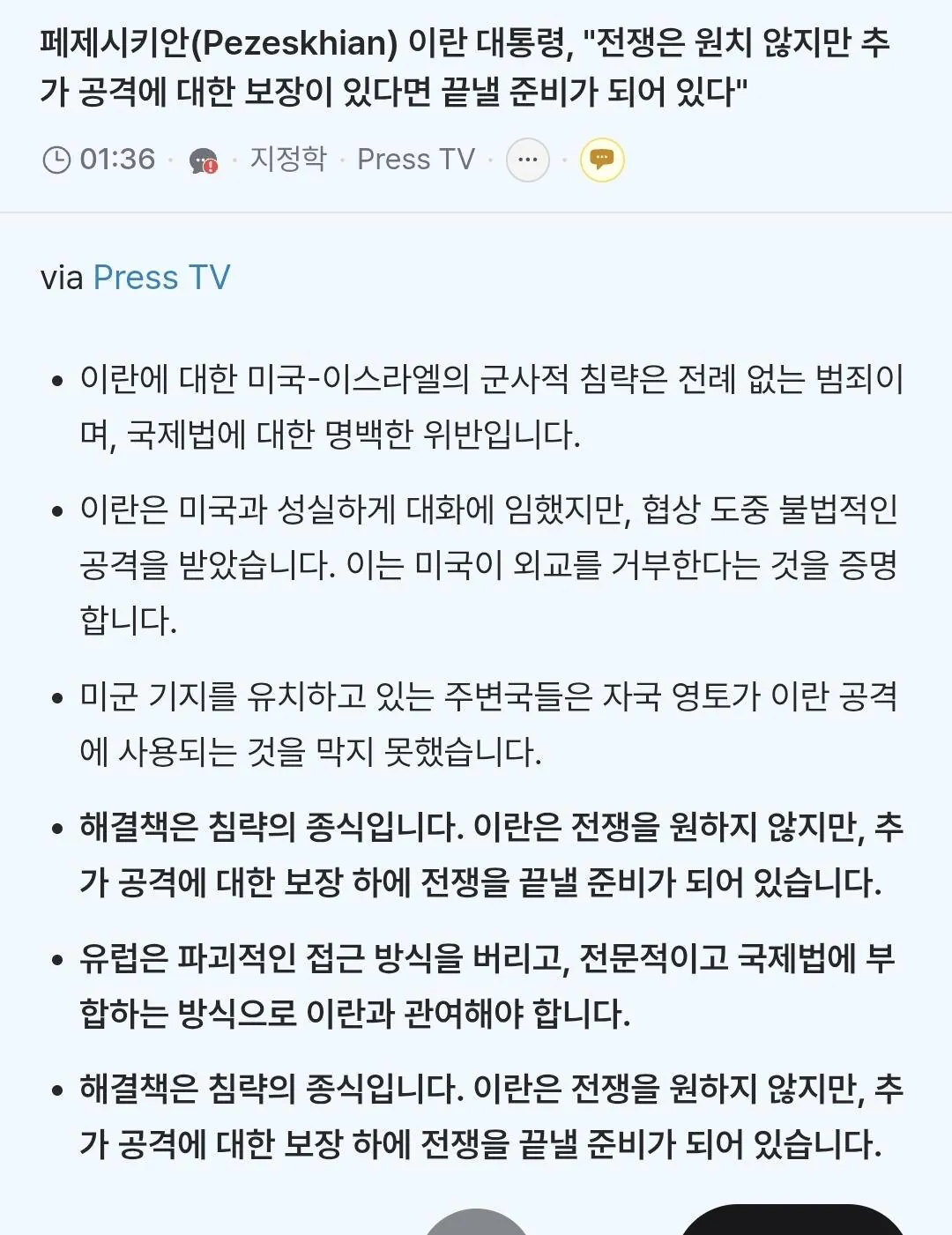 (속보) 이란 대통령 종전 발언 오피셜 전문