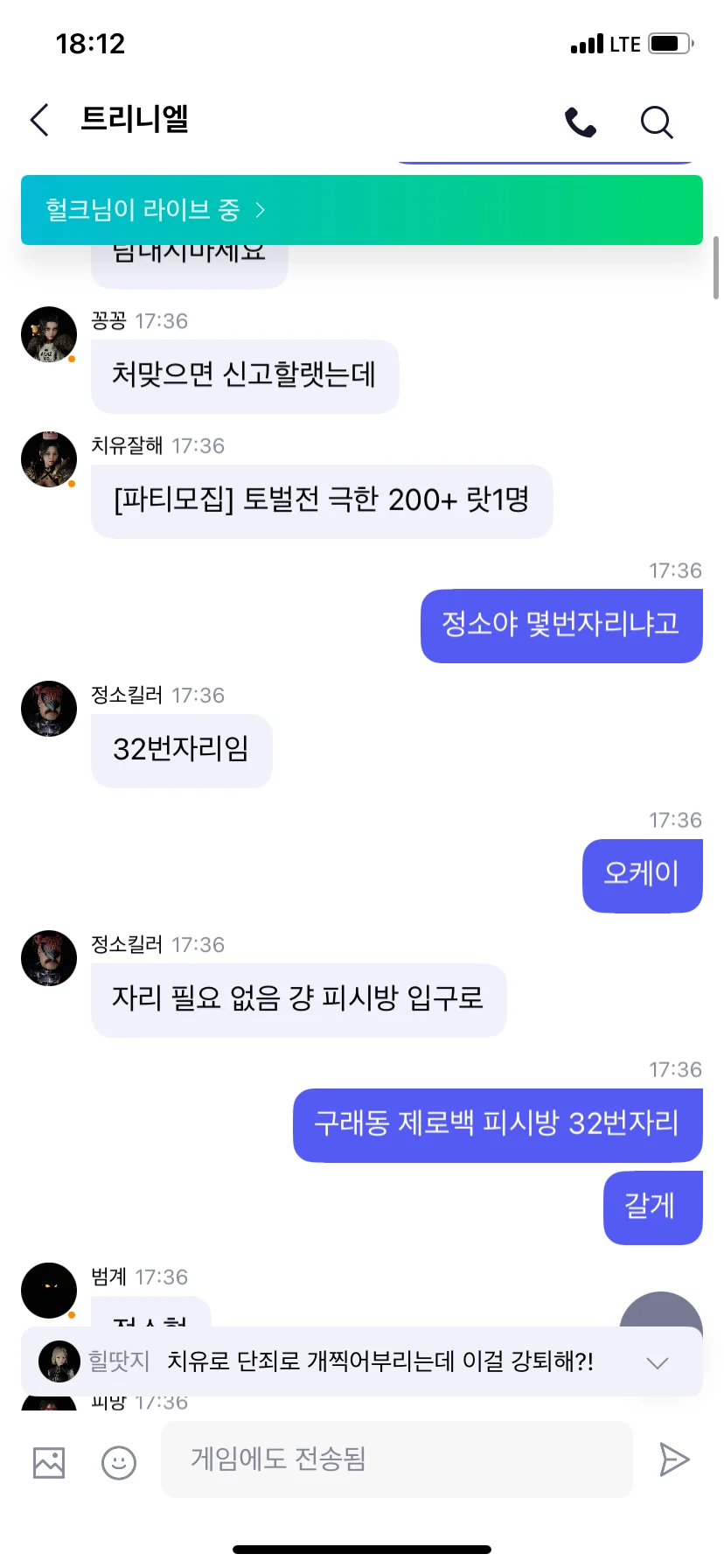 오픈톡으로 주소 교환하고 정소킬러가 게임중인 김포로 찾아가기로 합의함