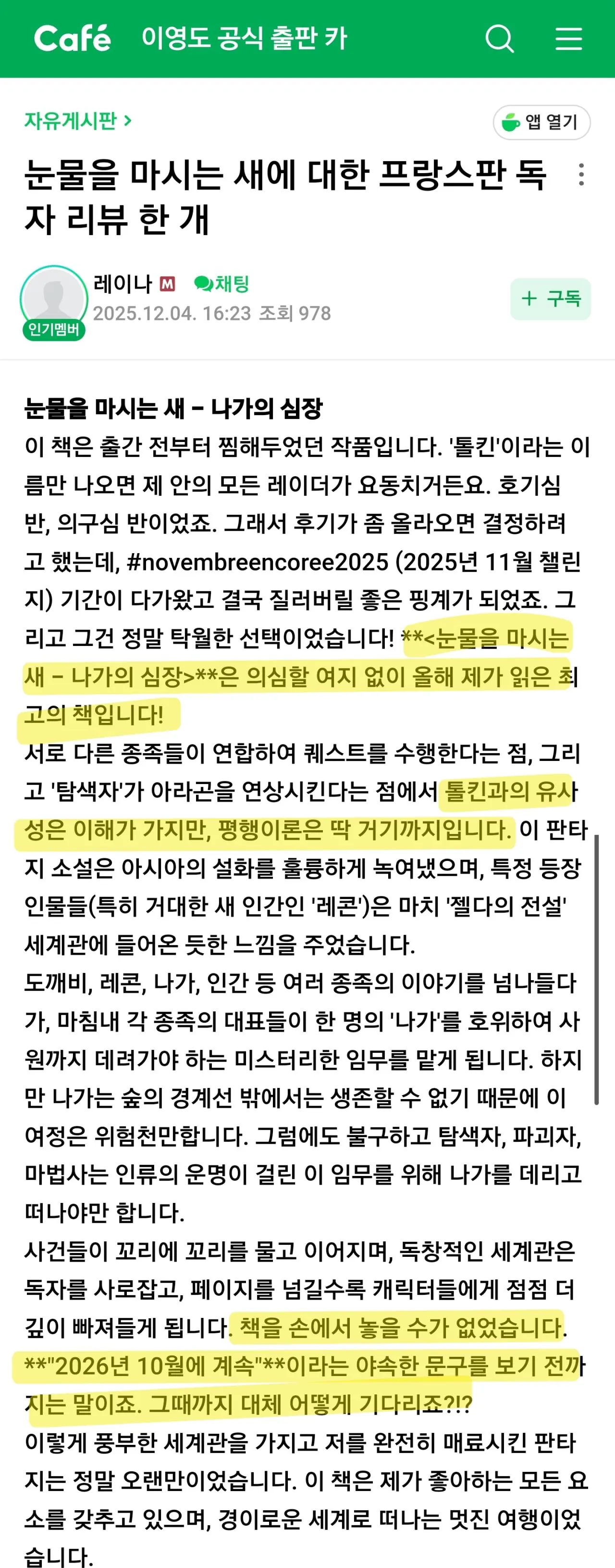 눈마새는 총 4권까지 있는데, 팬들사이에서 진입장벽이 커서 저점이라고 평가받는 1권 발매만으로 후보에 오름