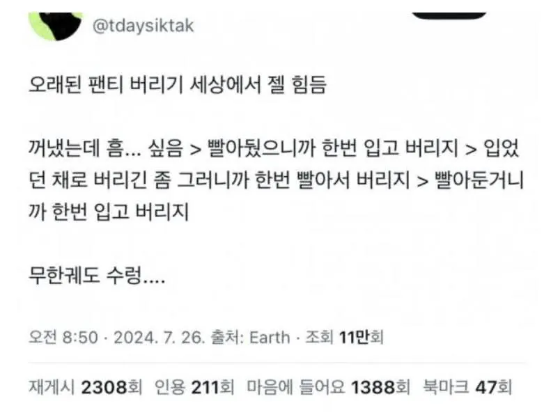 오래된 팬티가 버리기 세상에서 젤 힘듬