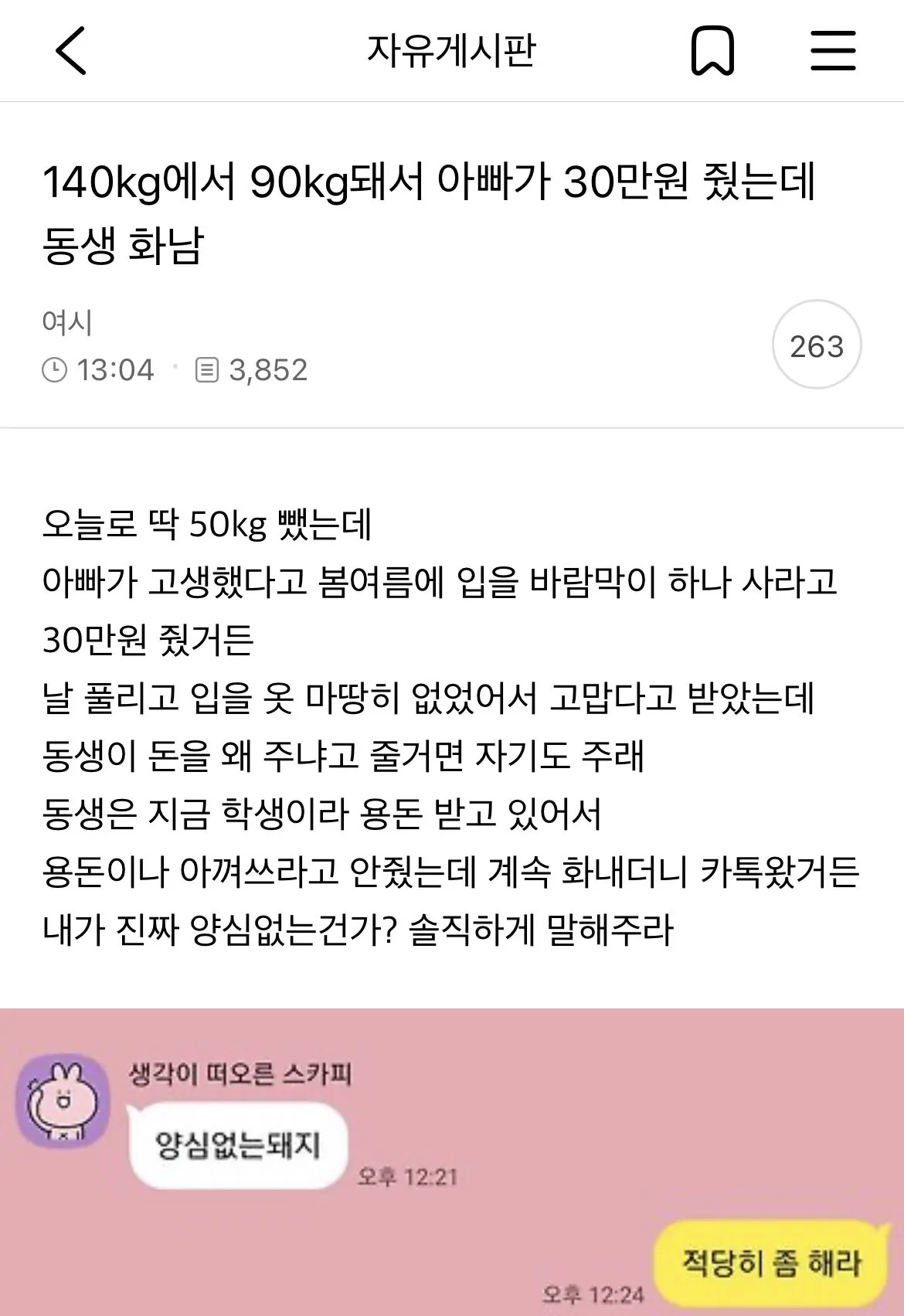 140kg에서 90kg돼서 아빠가 30만원 줬는데 동생 화남