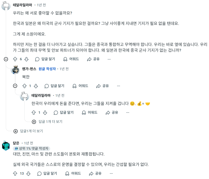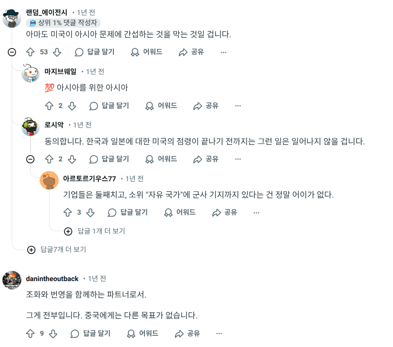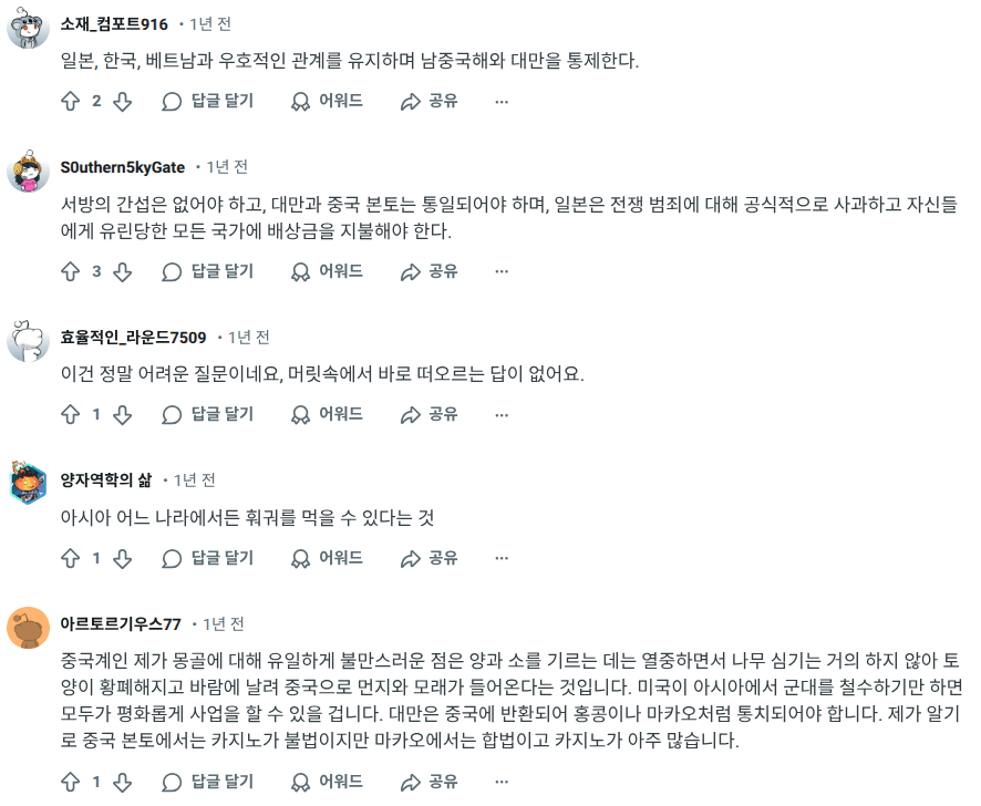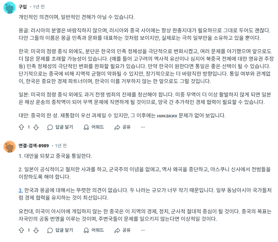 레딧보다가 우연히 발견한 게시글. 중국인들이 원하는 이상적인 동아시아의 미래상과 관련된 내용